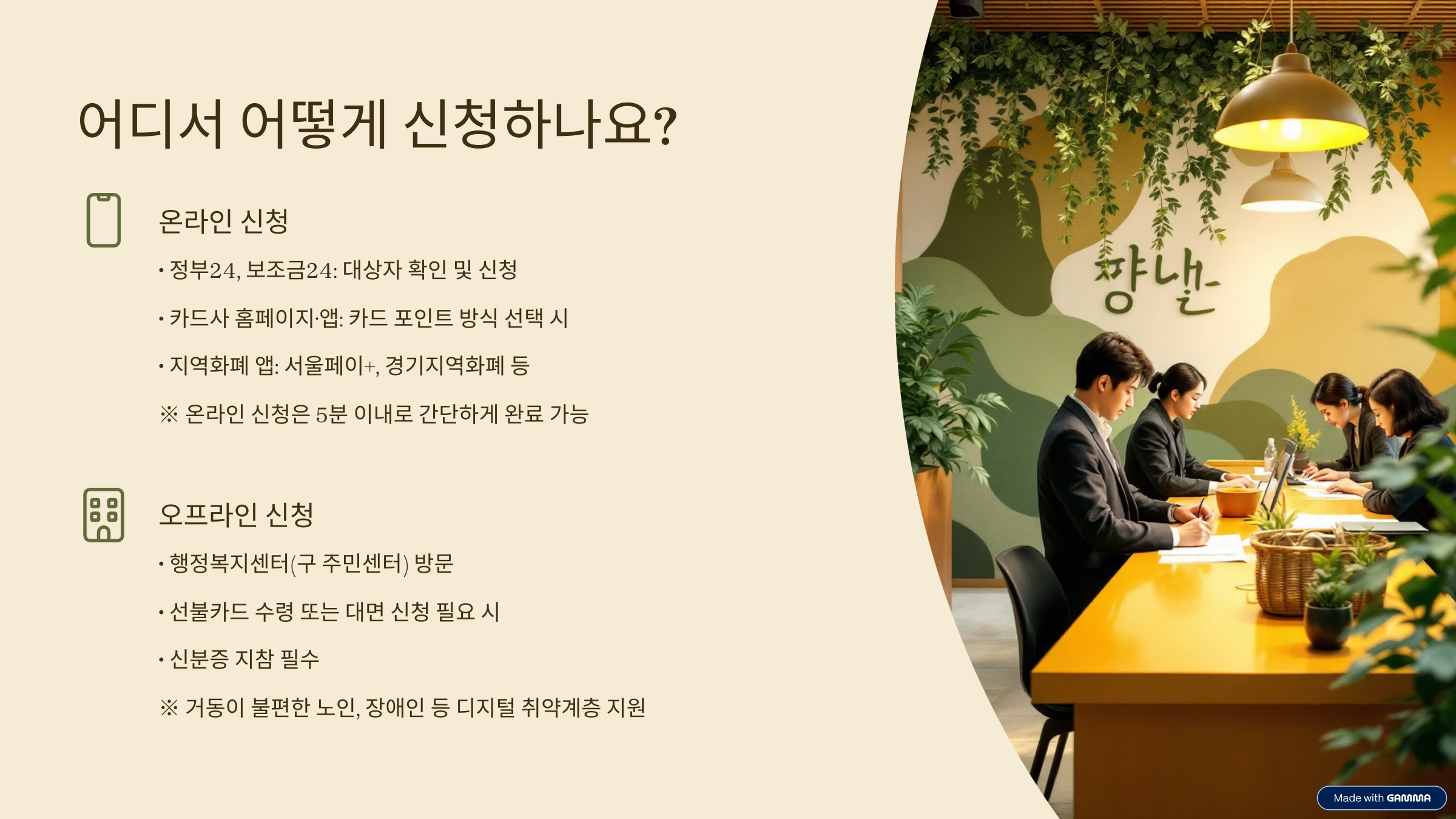 | 오프라인 | 행정복지센터(구 주민센터) | 선불카드 수령 또는 대면 신청 필요 시 방문 접수 |